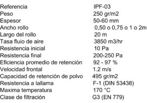 Características: Construido mediante un proceso no tejido y aumentando gradualmente la densidad de las fibras, permite el bloqueo de diversos tamaños de partículas en los diferentes niveles de densidad obteniendo una gran capacidad de retención de polvo y niebla de pintura.