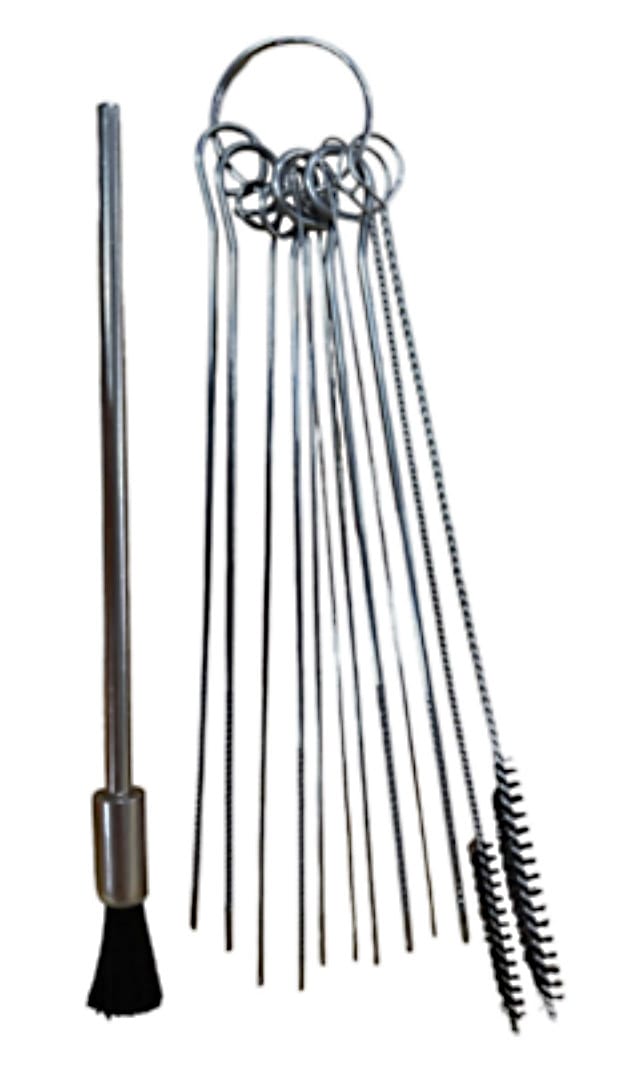 El KIT incluye cepillos con mangos retorcidos, duraderos para limpiar las boquillas de material, un cepillo y una escobilla para eliminar pequeños residuos y polvo, y juego de agujas para eliminar obstrucciones en casquillo y pico de fluido.