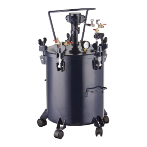Fabricado en lámina HR, sistema de presurización con agitación neumática, capacidad de 10 galones utilizado en la industria de la madera, pegantes, desmoldantes, resinas y otros materiales para procesos de pintura a presión, pegantes. Diseño robusto para presiones de trabajo hasta 80 PSI